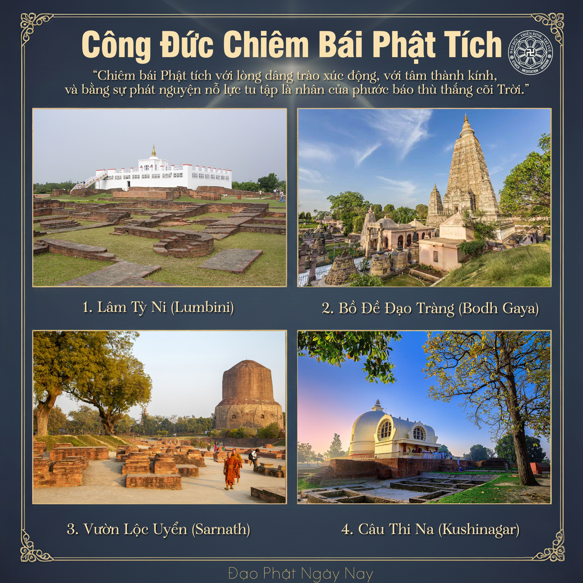 Trước khi diệt độ, Đức Phật đã ban bố những di huấn quan trọng cho các đệ tử về sau nương tựa tu hành. Dĩ nhiên nương tựa Pháp và Luật để thẳng tiến đến các Thánh quả giải thoát là tối cần nhưng không phải ai cũng làm được điều ấy. Để gieo trồng phước duyên với Phật và Thánh chúng, hàng đệ tử luôn tâm thành hướng vọng về bốn Thánh tích, tưởng nhớ đến nơi Phật đản sinh, nơi Phật Thành đạo, nơi Phật chuyển pháp luân và nơi Phật nhập Niết-bàn.