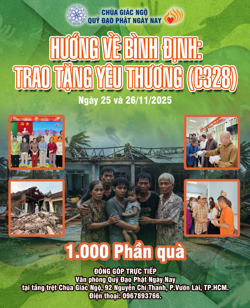 Chùa Giác Ngộ và Quỹ Đạo Phật Ngày Nay (Quỹ ĐPNN) phát động chương trình “Hướng về Bình Định: Trao tặng yêu thương” (C328). Chương trình đã nhận được sự quan tâm sâu sắc và những tấm lòng vàng từ quý mạnh thường quân, quý nhà hảo tâm khắp nơi. Những đóng góp quý báu này không chỉ là vật chất mà còn là nguồn động viên tinh thần to lớn, thắp lên niềm hy vọng cho bà con vùng bão.