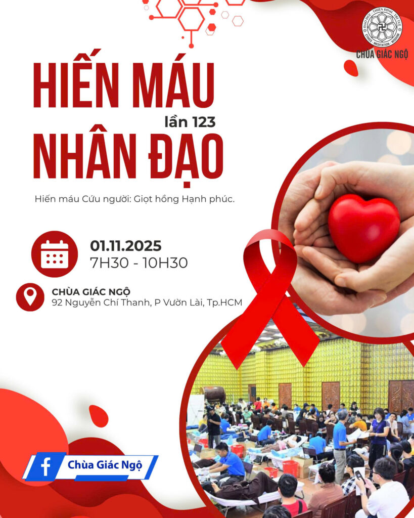 Để lan tỏa hơn nữa những giá trị tốt đẹp và tiếp tục mang lại sự sống cho những bệnh nhân cần máu, Chùa Giác Ngộ trân trọng thông báo sẽ tiếp tục phối hợp cùng Trung tâm Hiến máu Nhân đạo Thành phố tổ chức chương trình hiến máu tiếp theo:
