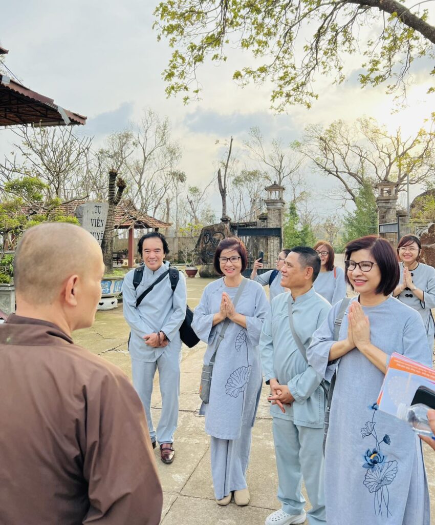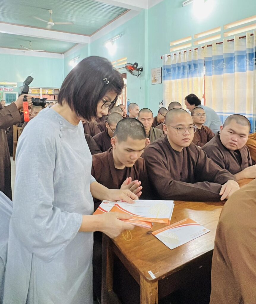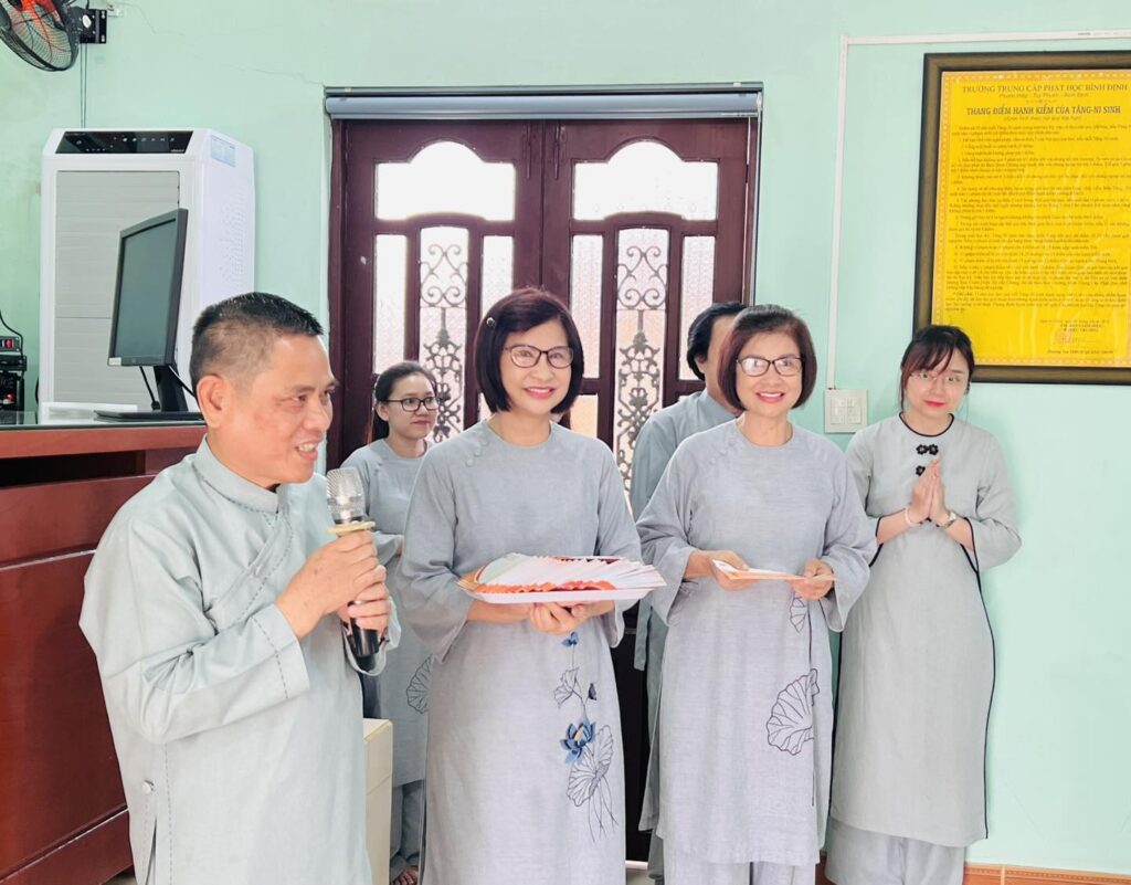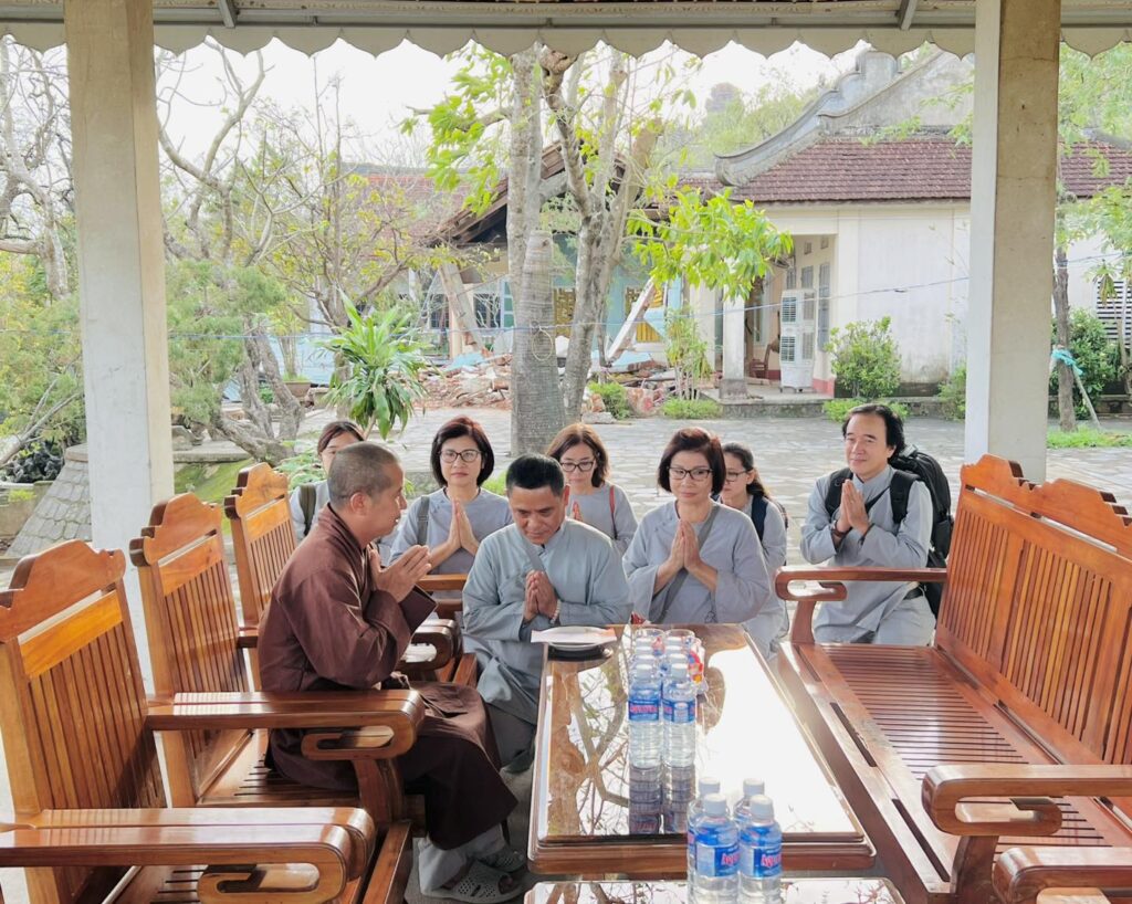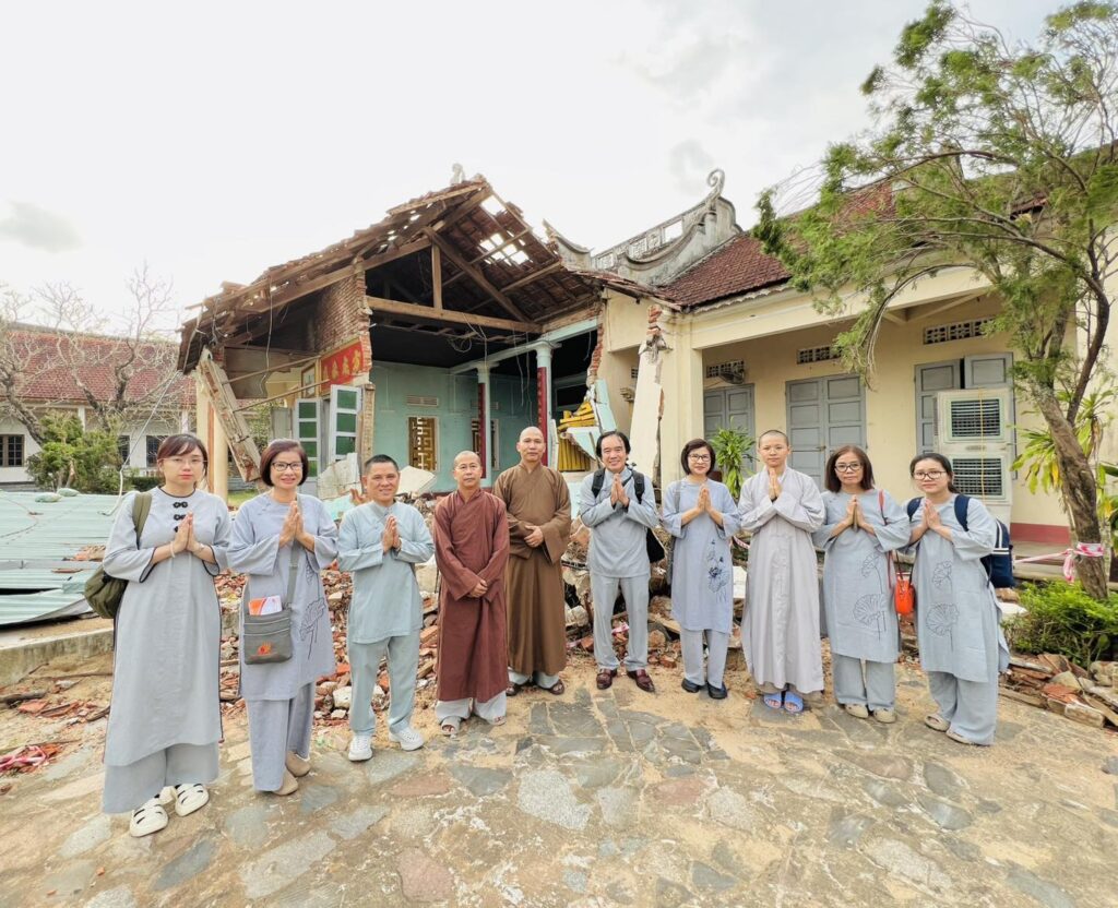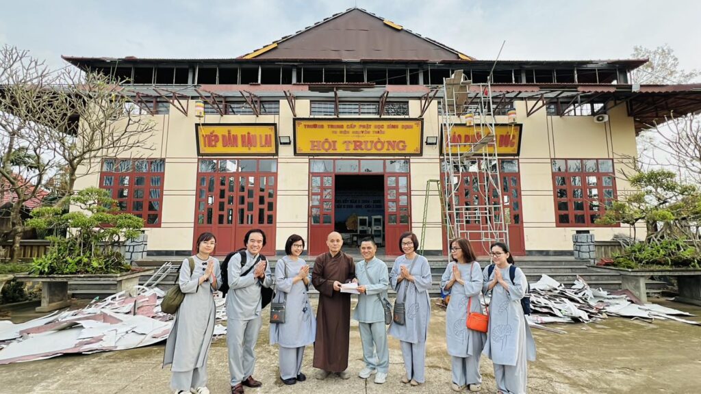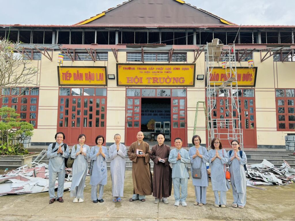 Tại buổi thăm, chia sẻ những thiệt hại do thiên tai gây ra, đoàn Chùa Giác Ngộ và Quỹ Đạo Phật Ngày Nay dâng cúng tịnh tài khắc phục hậu quả thiên tai tại Trường Trung cấp Phật học Bình Định – Tu viện Nguyên Thiều.