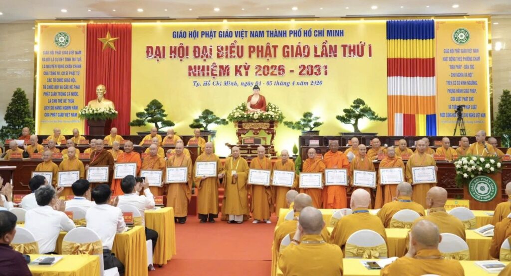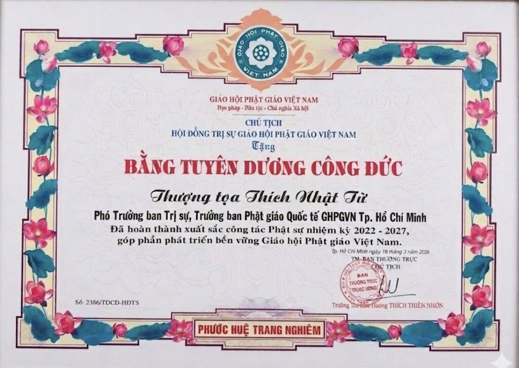 Thầy Nhật Từ nhận bằng Tuyên dương Công đức của Trưởng lão Hoà thượng Thích Thiện Nhơn, Chủ tịch Hội đồng Trị sự GHPGVN về việc hoàn thành xuất sắc Phật sự nhiệm kỳ 2022-2027, góp phần phát triển bền vững GHPGVN, nhân dịp Đại hội Đại biểu GHPGVN TPHCM, ngày 4/4/2026.